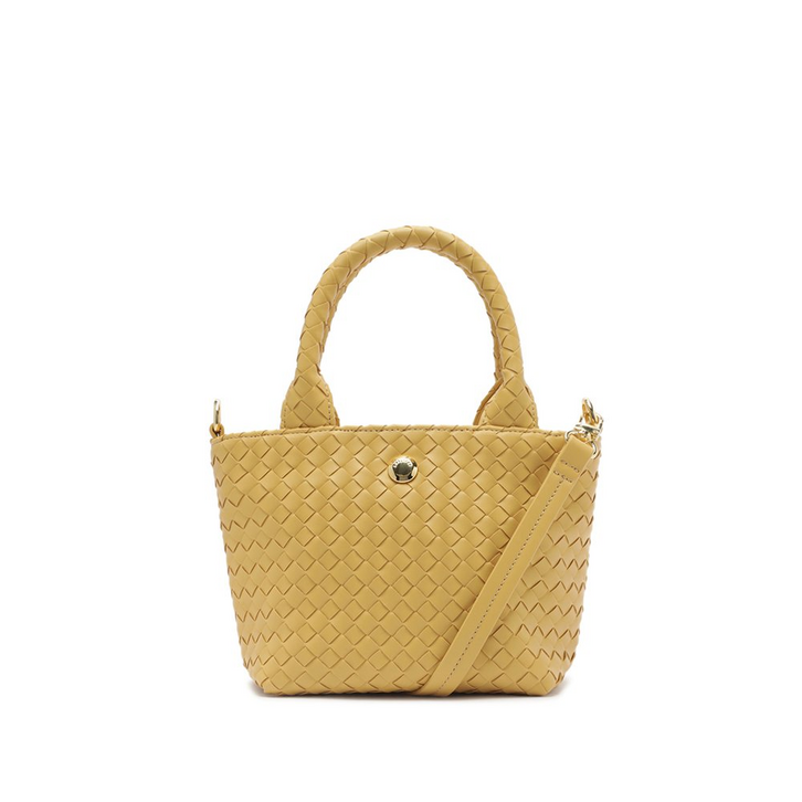 Bolsa mini tote com efeito tramado, na cor amarela. O modelo apresenta shape retangular e estruturado, com efeito soft e acabamento texturizado imponente - com efeito em trama artesanal nas capas. Traz alças de ombro fixas e uma alça longa, regulável e removível. Apresenta fechamento superior por zíper metálico, com puxador personalizado Anacapri. Possui forro em tom rosê e etiqueta emborrachada exclusiva Anacapri. Traz aplicação de pin metálico imponente Anacapri, centralizado na parte superior da capa frontal.