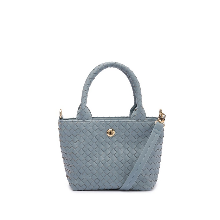 Bolsa mini tote com efeito tramado, na cor azul. O modelo apresenta shape retangular e estruturado, com efeito soft e acabamento texturizado imponente - com efeito em trama artesanal nas capas. Traz alças de ombro fixas e uma alça longa, regulável e removível. Apresenta fechamento superior por zíper metálico, com puxador personalizado Anacapri. Possui forro em tom rosê e etiqueta emborrachada exclusiva Anacapri. Traz aplicação de pin metálico imponente Anacapri, centralizado na parte superior da capa frontal.