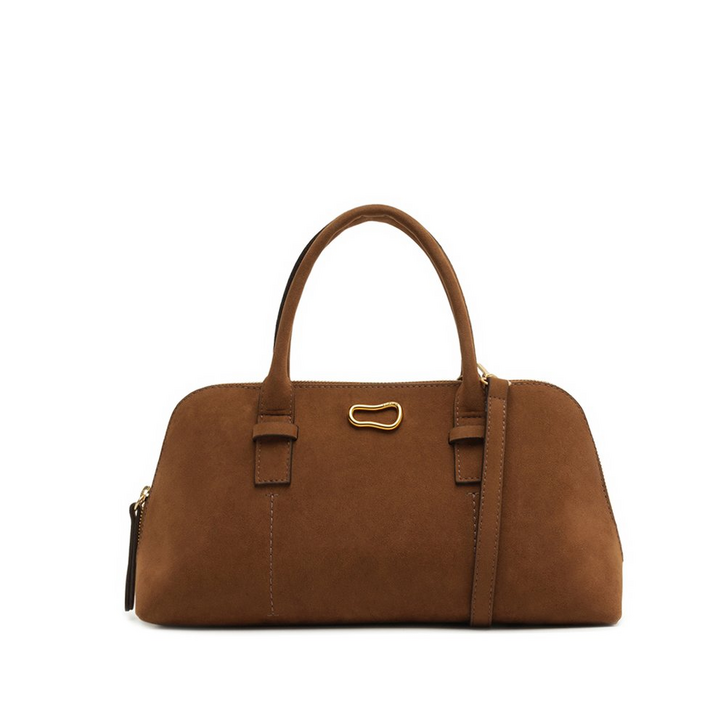 Bolsa tote grande, com adorno em metal, na cor marrom. O modelo em camurça possui shape retangular e estruturado. No tamanho G, traz alças de ombro fixas e uma alça longa transversal, regulável e removível. Com forro em tom rosê e bolsinho na parte interna. Com detalhe de acabamentos a fio contrastantes por toda a peça, possui fecho superior em zíper, com puxador em tira fina.Traz aplicação de adorno metálico imponente - com shape orgânico - centralizado na parte superior do tampo, com detalhe para assinatura discreta e personalizada Anacapri.