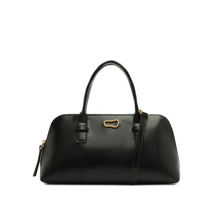 Bolsa tote grande, com adorno em metal, na cor preta. O modelo de material similar ao couro com acabamento envernizado, possui shape retangular e estruturado. No tamanho G, traz alças de ombro fixas e uma alça longa transversal, regulável e removível. Com forro em tom rosê e bolsinho na parte interna. Com detalhe de acabamentos a fio contrastantes por toda a peça, possui fecho superior em zíper, com puxador em tira fina.Traz aplicação de adorno metálico imponente - com shape orgânico - centralizado na parte superior do tampo, com detalhe para assinatura discreta e personalizada Anacapri.