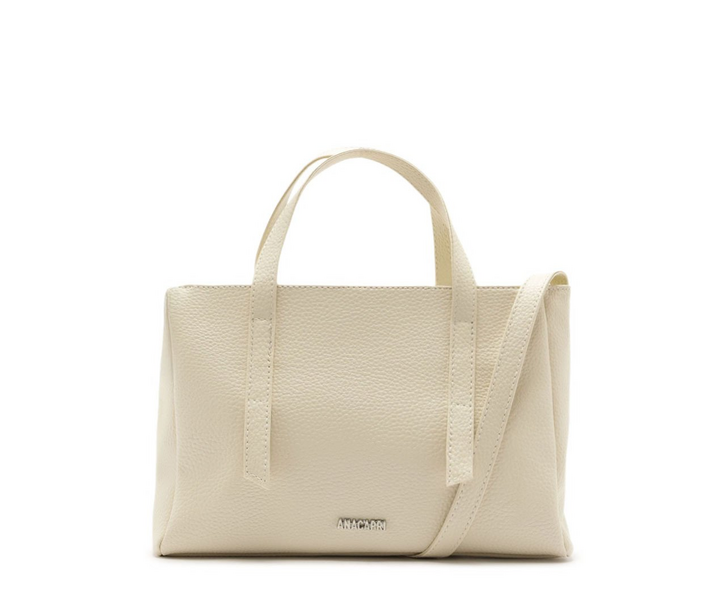 Bolsa tote média, na cor bege. O modelo de material similar ao couro possui shape estruturado, laterais arredondadas e acabamento texturizado. Traz duas alças de mão, com detalhe em tiras alongadas e costuradas nas capas, e uma alça longa, transversal e fixa. Possui fecho superior em zíper, com puxador em tira. Com forro rosê e etiqueta emborrachada exclusiva Anacapri, na parte interna. Traz assinatura Anacapri em carimbo metálico, na parte inferior da capa frontal.