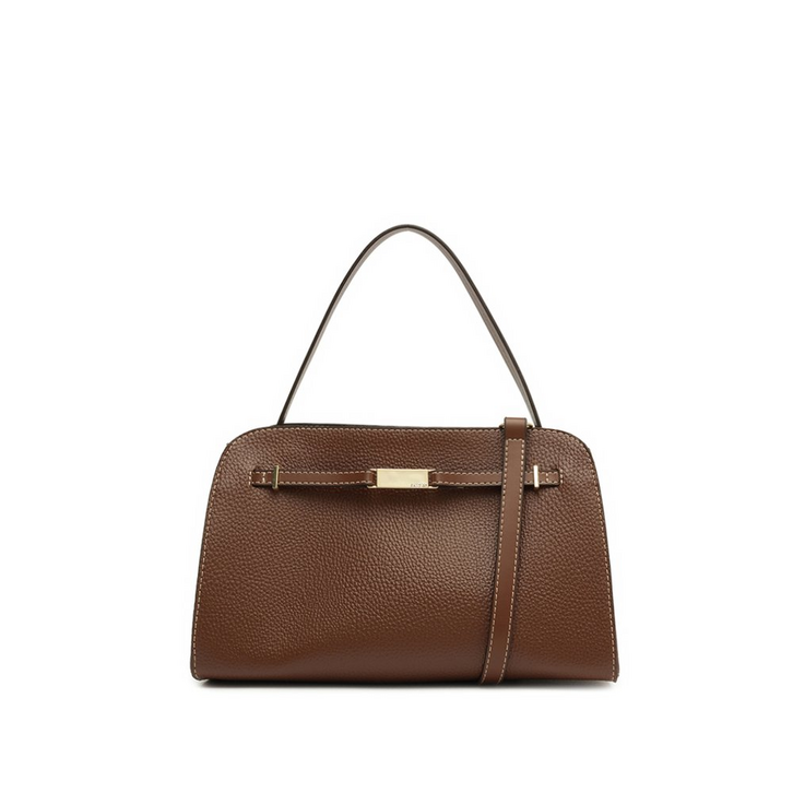 Bolsa tote estruturada média, com textura, na cor marrom. De material similar ao couro com efeito texturizado, o modelo traz shape estruturado e arredondado na parte superior. Possui uma alça de ombro fixa e outra alça longa, regulável e removível. Forrada na parte interna em tom rosê, traz bolso interno aberto. Apresenta fecho superior em zíper e detalhe de acabamentos a fio contrastantes. Traz detalhe frontal na capa, com aplicação de tira fina com placa metálica central imponente, com assinatura Anacapri personalizada.