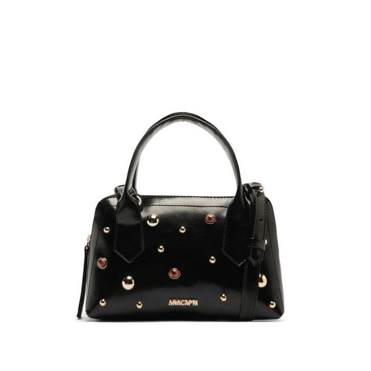 Bolsa tote média, com aplicação de pedraria e studs metálicos, na cor preta. O modelo de material similar ao couro, possui shape retangular e estruturado, com acabamento em costura a fio - contrastante e elegante - por toda a peça. No tamanho mini, possui alças de ombro fixas com efeito dobrado e uma alça longa regulável, com fecho superior em zíper, com puxador em tira e forro colorido na parte interna. Traz aplicação de pedrarias com resinas coloridas e studs metálicos - de tamanhos variados - na capa frontal. Traz aplicação de pin metálico Anacapri, centralizado na parte inferior da capa frontal.