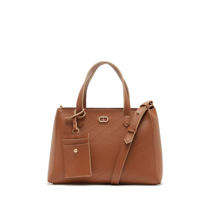 Bolsa tote média, com porta-cartão, na cor marrom. O modelo vem para a temporada com shape retangular maxi e estruturado. No tamanho M, de material similar ao couro, possui detalhe de acabamento em costura matelassê com design na diagonal. Traz alças de ombro fixas - com detalhe em costura a fio - e uma alça longa transversal, regulável e removível. Com fecho superior por zíper, traz aplicação de cápsula em metal Anacapri, centralizada na parte superior da capa frontal. Acompanha bag charm com porta-cartão, com três divisórias, no mesmo tom da peça, com aplicação de rebite metálico e costura ornamental no contorno. O acessório é removível e pode ser utilizado separadamente da bolsa.