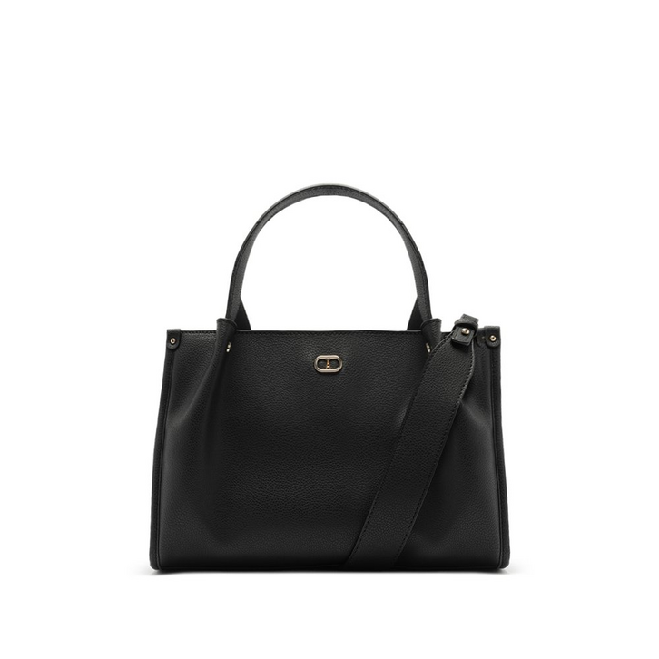 Bolsa tote média e texturizada, na cor preta. Com shape retangular, o modelinho vem para a temporada em material similar ao couro soft com textura. Apresenta duas alças de ombro fixas e uma alça longa removível por mosquetão em tira mais larga, com acabamento em costura pesponto. Forrada na parte interna, traz fecho superior em zíper. Traz detalhe de rebites metálicos na parte superior da peça. Apresenta aplicação de pin metálico em cápsula, com inscrição da inicial “A” - assinatura Anacapri, centralizado na parte superior da capa frontal.
