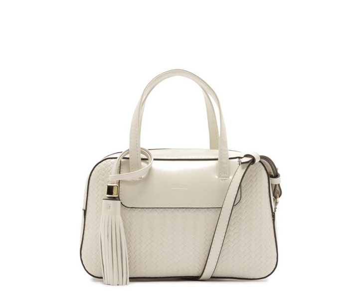 Bolsa tote média branca, em material similar ao couro. O modelo possui shape estruturado com acabamento a fio. A parte frontal traz textura tramada, enquanto a parte superior é lisa com faixa que recebe assinatura Anacapri. Vem com bag charm removível em barbicacho, com dado metalizado em detalhe. Possui duas alças de mão e alça tiracolo removível e regulável, oferecendo diferentes formas de uso. Fechamento superior em zíper. Na parte interna, apresenta forro em tom rosé, bolso flat funcional e etiqueta personalizada com a frase “Leve a vida numa bolsa”.