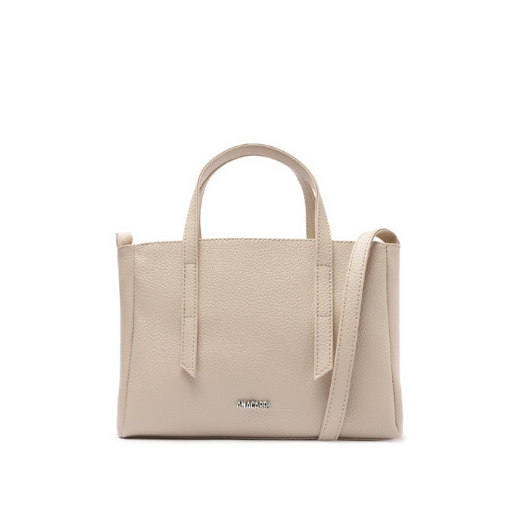 Bolsa tote média na cor branca. O modelo de material similar ao couro tem formato estruturado, laterais arredondadas e acabamento texturizado. Traz duas alças de mão, em tiras alongadas e costuradas nas capas, e alça transversal. Possui fecho superior em zíper e puxador. Com inscrição metálica em alto-relevo Anacapri na parte inferior da capa.
