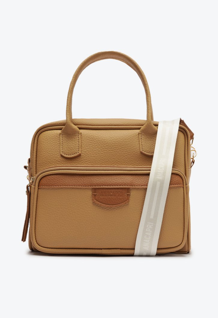 Bolsa tote Belle nude e marrom. O modelo estruturado de material similar ao couro com acabamento texturizado vem para a temporada em tamanho médio e possui duas alças de mão e outra alça transversal em gorgurão regulável e removível, com assinatura exclusiva Anacapri. De shape retangular, traz acabamento arredondado nos cantos. Forrada e com bolsinho na parte interna, ela possui fecho superior em zíper, com puxador em tira. No bolso externo, traz detalhe com aplicação de tira marrom e etiqueta personalizada, com assinatura Anacapri e fecho em zíper com puxador.
