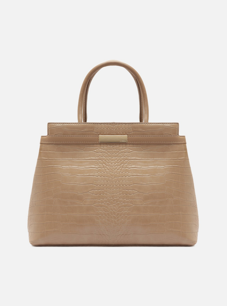 Bolsa feminina tote grande nude com textura croco. O acessório tem formato estruturado e acabamento texturizado. Possui alças de mão médias e detalhe metálico com inscrição do nome da marca na parte superior frontal. Traz fecho interno em zíper e amplo espaço interno.