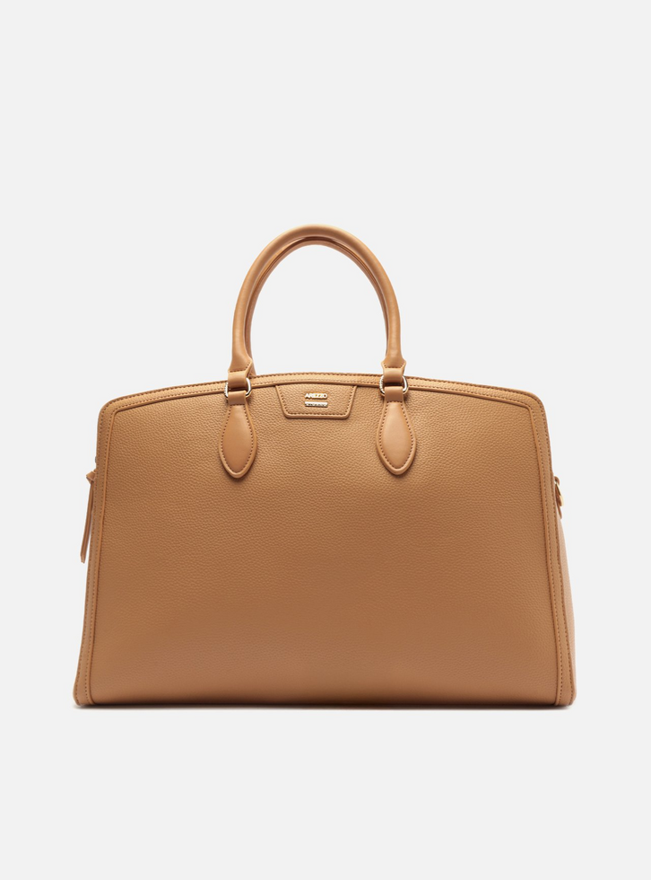 Bolsa feminina tote nude grande. O acessório possui formato retangular e estruturado, com duas alças de mão fixas com reforço e aplicação de metal dourado na base. Possui fecho superior em zíper metálico. A parte superior traz uma faixa de couro lisa que percorre o topo da bolsa, com inscrição do nome da marca em relevo metálico. Conta com puxador alongado em tira e acabamentos laterais também em metal.