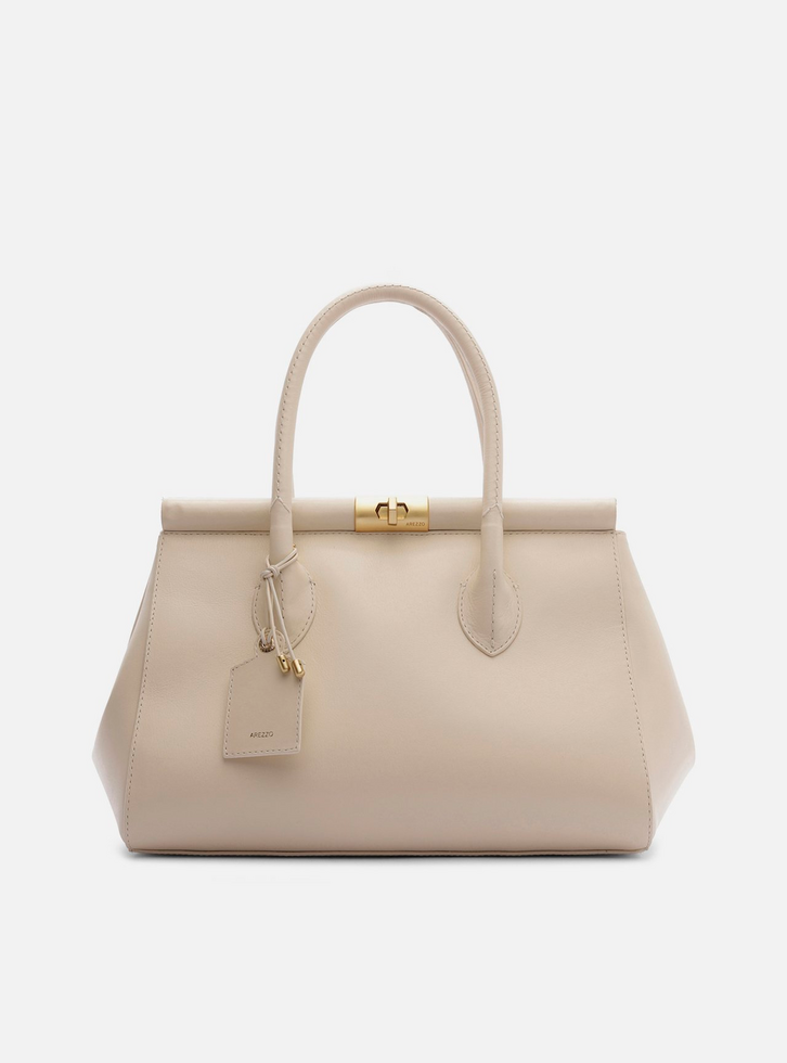 Bolsa tote grande de couro off white. O acessório tem formato estruturado e laterais estendidas. Traz alça tiracolo regulável e alças de mão estruturadas. Com detalhe em rolotê no topo e fecho em peça de metal com encaixe. Possui bolso externo traseiro e bag charm em peça de couro presa à alça.