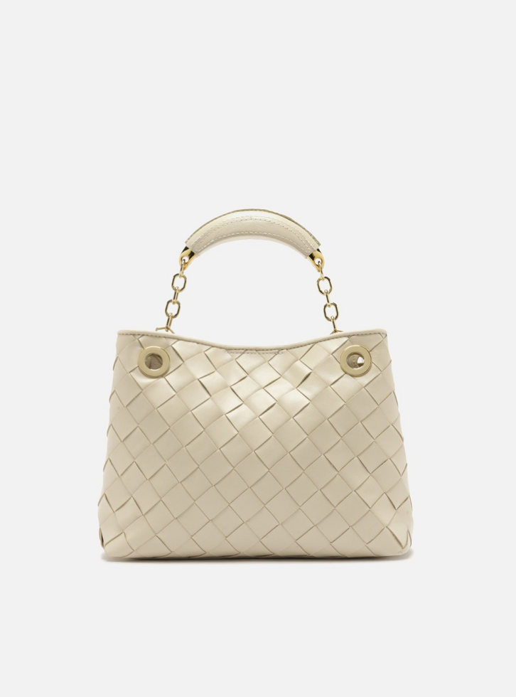 Bolsa feminina tote média em couro off-white. O acessório tem formato estruturado e capa frontal em tressê. Possui alças de ombro em tiras rolotê e alça de mão em correntes metálicas, presas por ilhoses e argolas, com peça larga revestida em couro. Conta com duas divisórias internas, fecho superior em ímã e bolso interno com zíper.