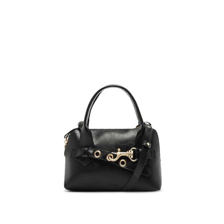 Bolsa tote pequena, com detalhe em gancho, na cor preta. O modelo vem para a temporada com shape mini bag retangular, com cantos arredondados. No tamanho P, de material similar ao couro, com efeito natural e texturizado. Traz alças de ombro fixas e uma alça extra: transversal, regulável e removível. Apresenta forro interno especial em vermelho e fecho superior por zíper. Traz detalhe imponente centralizado na capa frontal, com aplicação de tira com ilhós e mosquetão metálico em banho especial, com engate estilo gancho. Com assinatura Anacapri em baixo relevo, centralizada na parte inferior da capa frontal.