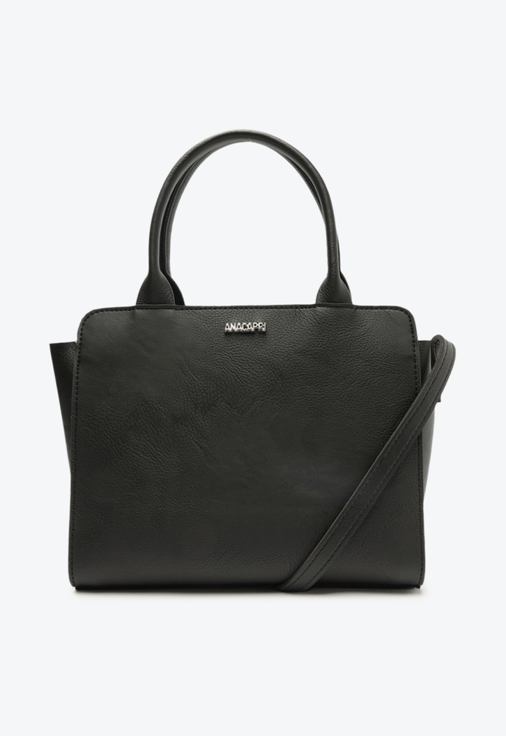 Bolsa tote Anacapri básica preta. No tamanho M, possui alça longa em tira transversal regulável e duas alças de mão reforçadas. O modelo quadrado apresenta shape moderno e estruturado, com fecho superior em zíper e puxador em tira. Forrada na parte interna, traz assinatura Anacapri em pin metálico aplicado na capa frontal.