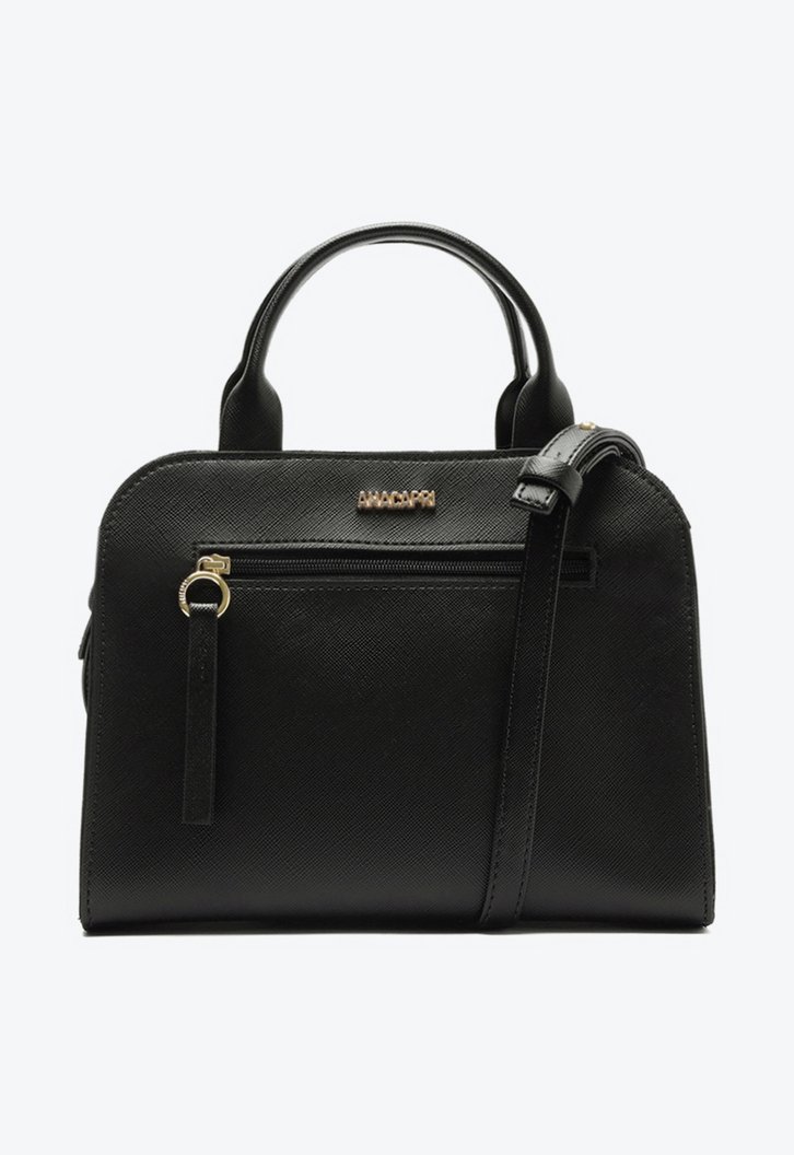Bolsa tote Anacapri preta. O modelo de tamanho médio apresenta shape retangular e estruturado. Traz duas alças de mão e uma alça longa regulável para uso transversal ou a tiracolo. Possui fechamento superior em zíper com puxador em tira, assim como bolso externo. Com aplicação de aviamento metálico com assinatura Anacapri na capa frontal.
