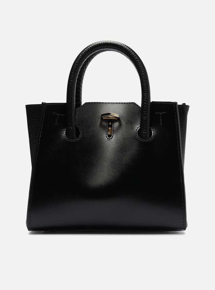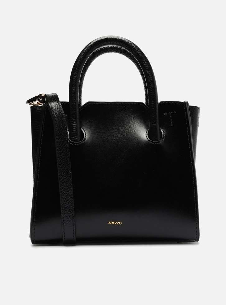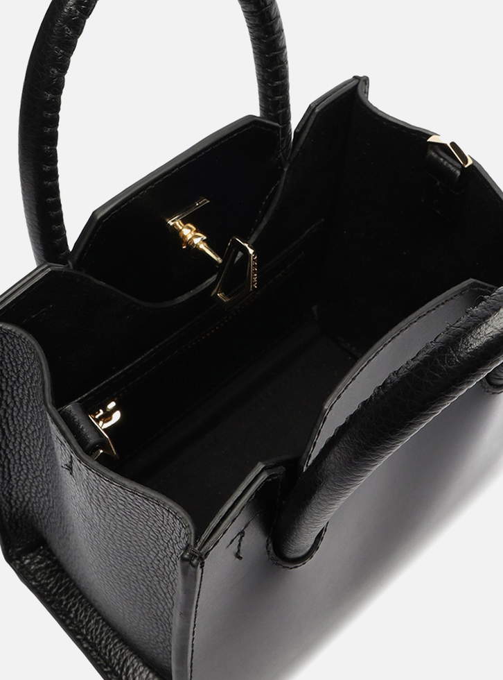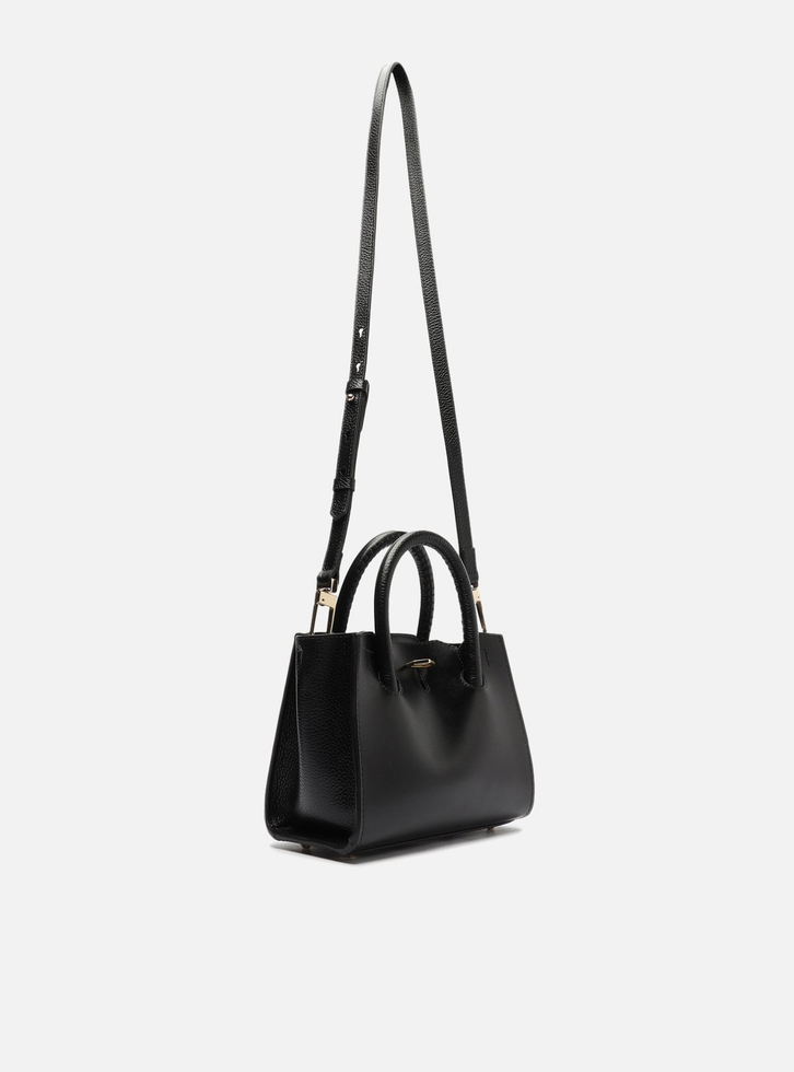 Bolsa tote pequena de couro preta. O modelo tem formato estruturado, laterais arredondadas e acabamento acetinado. Traz duas alças de mão em rolotê texturizado e alça lateral regulável e removível. Possui fecho em encaixe metálico e detalhe texturizado nos foles laterais.