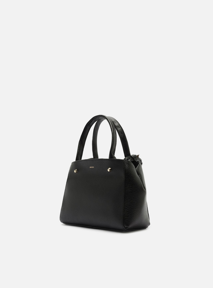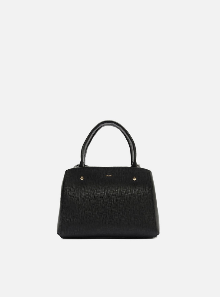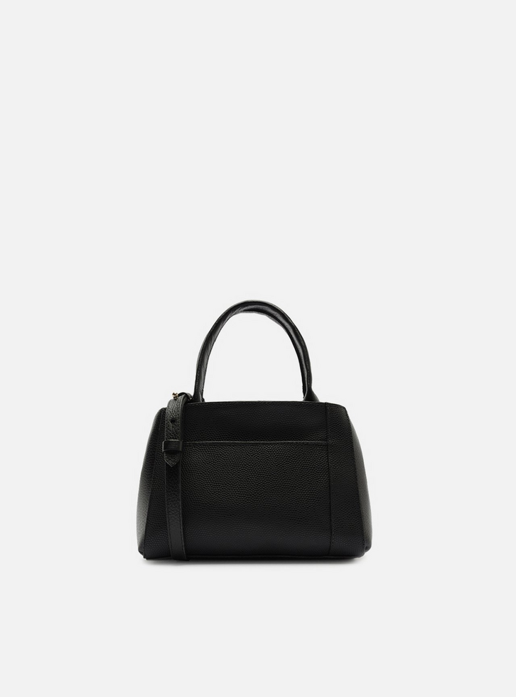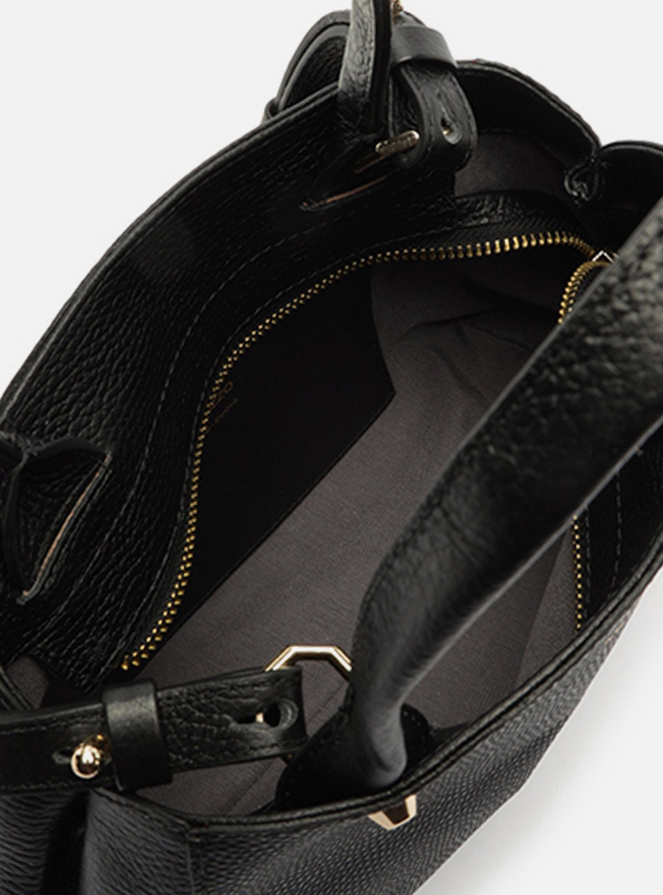 Bolsa tote feminina pequena de couro preta. O acessório tem formato estruturado, acabamento texturizado e inscrição discreta do nome da marca, além de aplicação de rebites. Traz alça tiracolo fina regulável e removível e alças de mão estruturadas. Possui fecho superior em zíper com puxador em tira e acompanha bag charm em couro, preso à bolsa por tira fina.