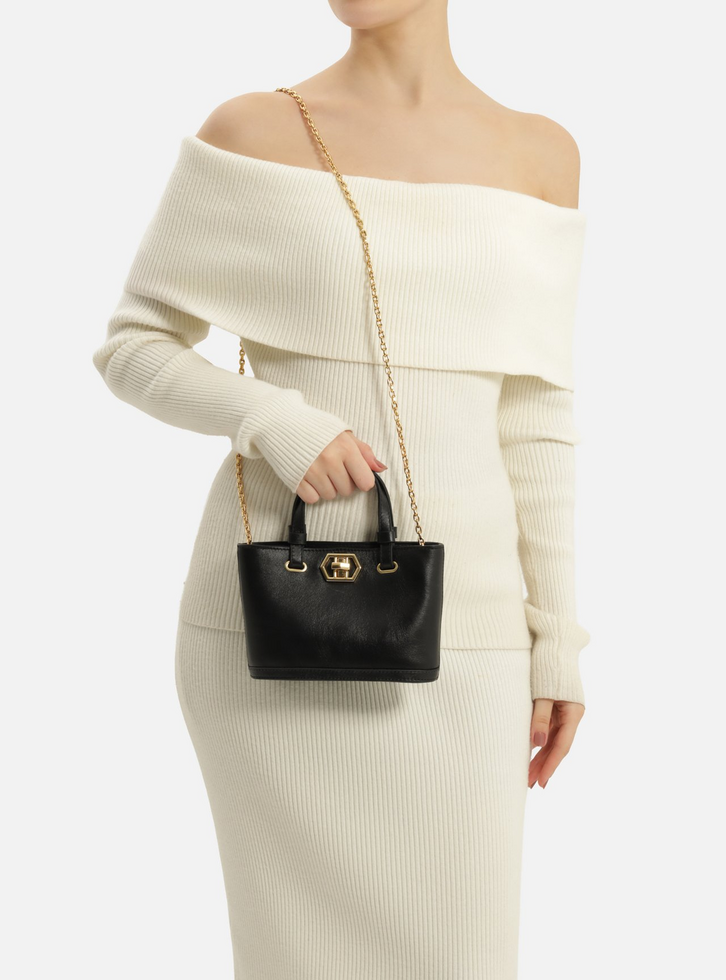 Bolsa tote pequena preta em couro. O acessório tem formato estruturado e acabamento texturizado, além de moldura. Traz fecho frontal em peça de metal, alças de mão e alça em corrente metálica fina removível.