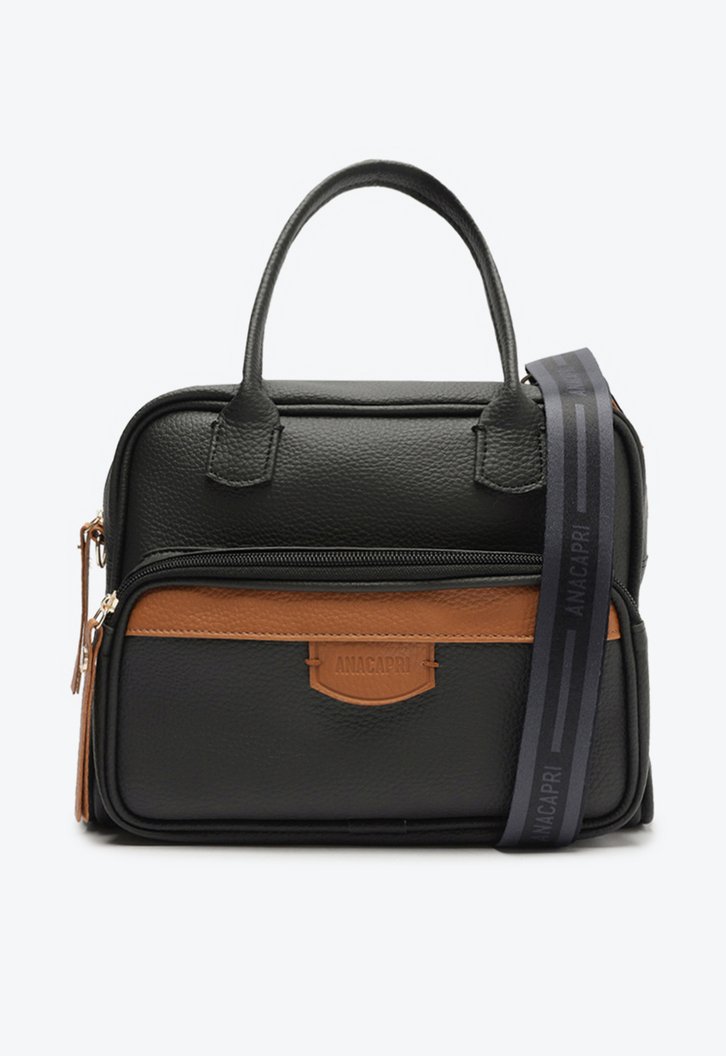 Bolsa tote Belle preta e marrom. O modelo estruturado de material similar ao couro com acabamento texturizado vem para a temporada em tamanho médio e possui duas alças de mão e outra alça transversal em gorgurão regulável e removível, com assinatura exclusiva Anacapri. De shape retangular, traz acabamento arredondado nos cantos. Forrada e com bolsinho na parte interna, ela possui fecho superior em zíper, com puxador em tira. No bolso externo, traz detalhe com aplicação de tira marrom e etiqueta personalizada, com assinatura Anacapri e fecho em zíper com puxador.