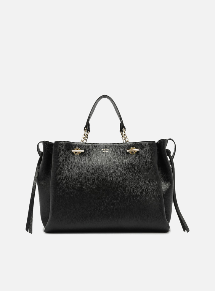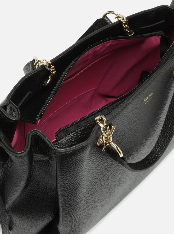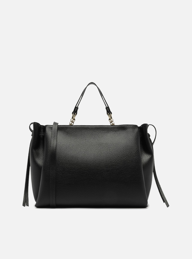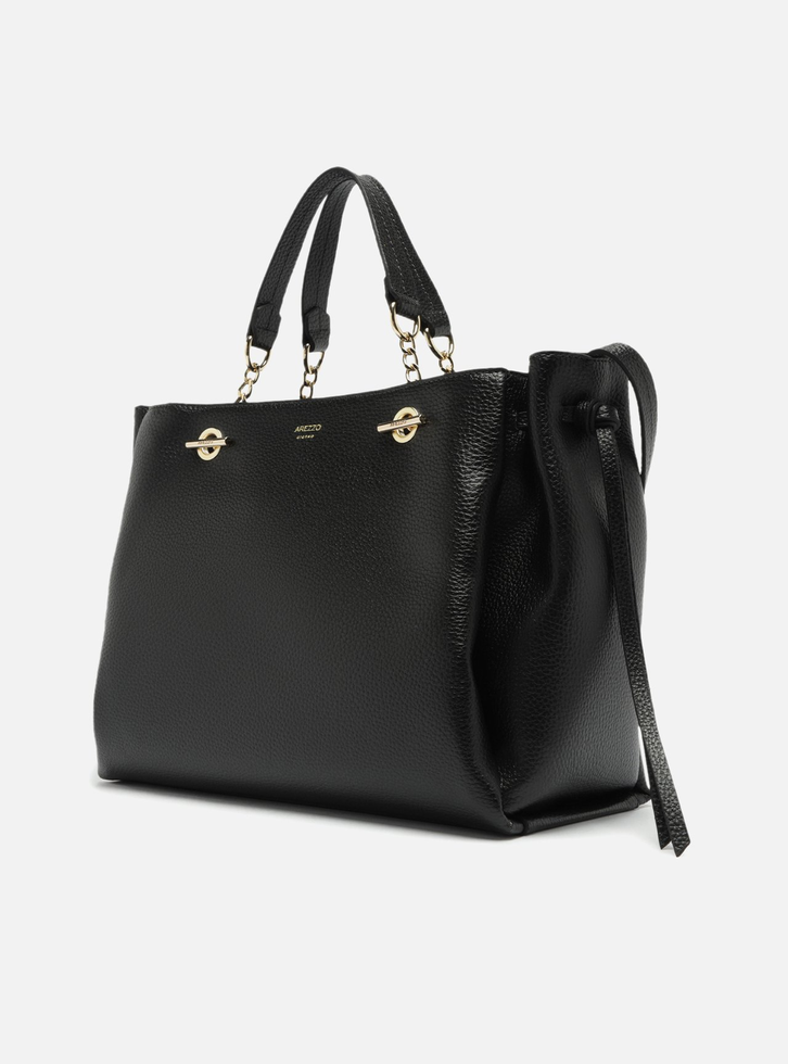 Bolsa tote grande preta. O acessório tem formato estruturado e acabamento macio. Traz alça lateral regulável, duas alças de mão presas por metais e fecho em zíper e puxador. Com aplicação de tiras nas laterais.