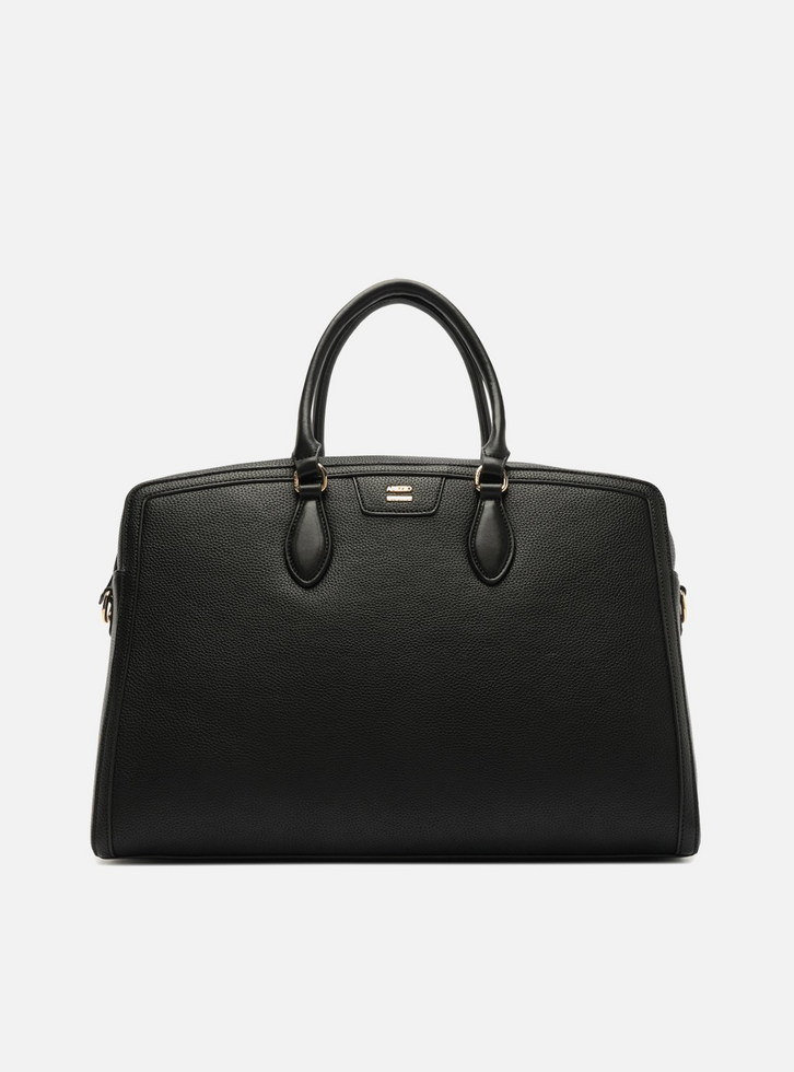 Bolsa feminina tote preta grande. O acessório possui formato retangular e estruturado, com duas alças de mão fixas com reforço e aplicação de metal dourado na base. Possui fecho superior em zíper metálico. A parte superior traz uma faixa de couro lisa que percorre o topo da bolsa, com inscrição do nome da marca em relevo metálico. Conta com puxador alongado em tira e acabamentos laterais também em metal.