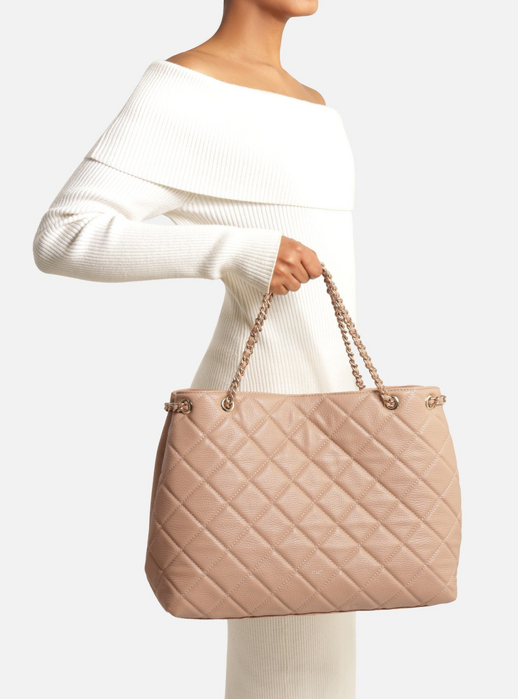 Bolsa tote grande rosa claro de couro. O acessório tem formato estruturado, laterais sanfonadas e capa com costuras em matelassê. Traz alças em corrente metálica com tiras de couro entrelaçadas, presas à bolsa na parte superior por metais vazados. Com fecho em imã interno e inscrição do nome da marca na capa.