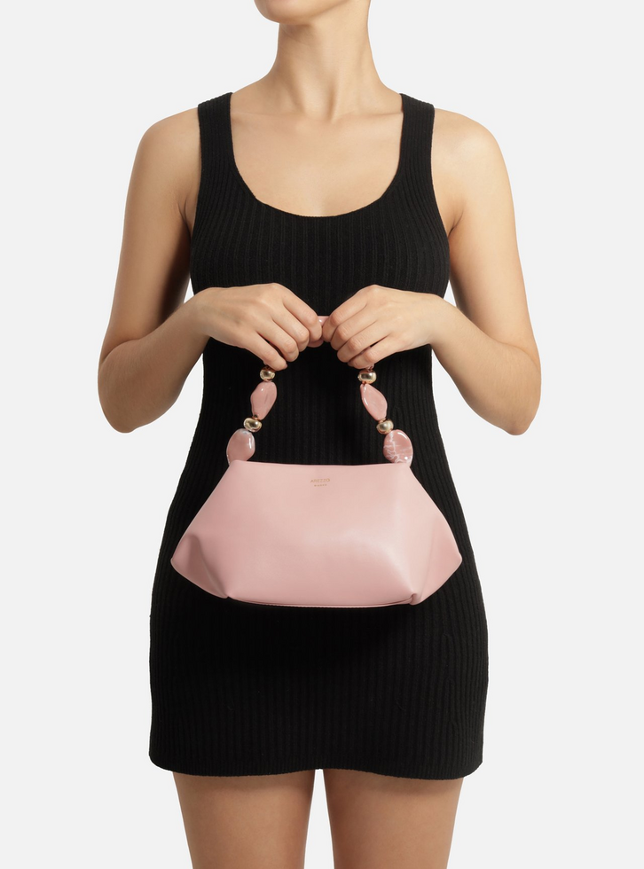 Bolsa tote média rosa. O acessório tem formato estruturado e laterais amplas. Traz alça lateral fina, com regulagem e removível, e alça de mão composta por pedras resinadas e peças metálicas douradas. Possui fecho superior em imã interno e bolso frontal interno também com fecho em imã. Parte interna forrada.