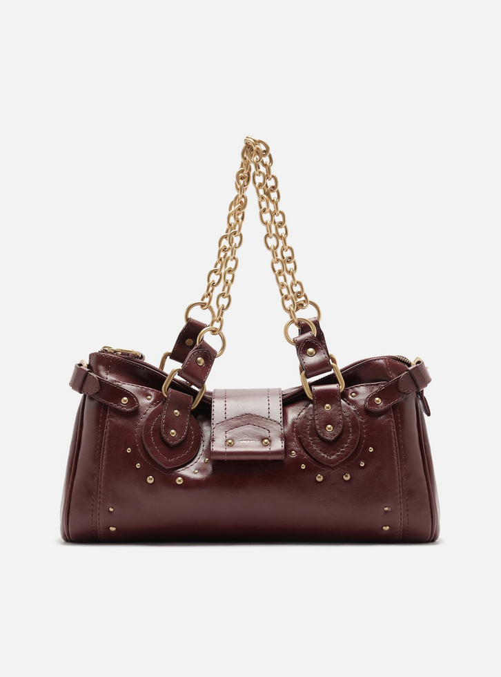 Bolsa feminina tote grande de couro bordô. O acessório tem formato estruturado e alongado, acabamento liso e laterais arredondadas com detalhe em tiras afiveladas. Traz alça tiracolo longa, regulável e removível e alças de mão em corrente metálica dourada, presa por argolas e peças de couro. Fecho em zíper e puxador em tira, além de bolso externo frontal e tira larga sobreposta com imã. Com aplicação de rebites dourados por toda a bolsa.