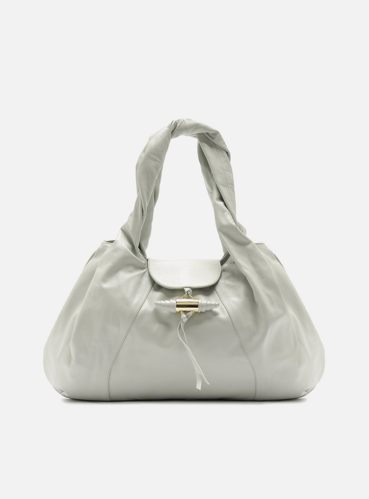 Bolsa maleável na cor verde, confeccionada em couro liso. Possui alça de ombro torcida. O fechamento principal é feito por uma aba que se sobrepõe e se prende por um fecho em formato de bastão dourado, com uma tira fina e pingente que decora a parte frontal.