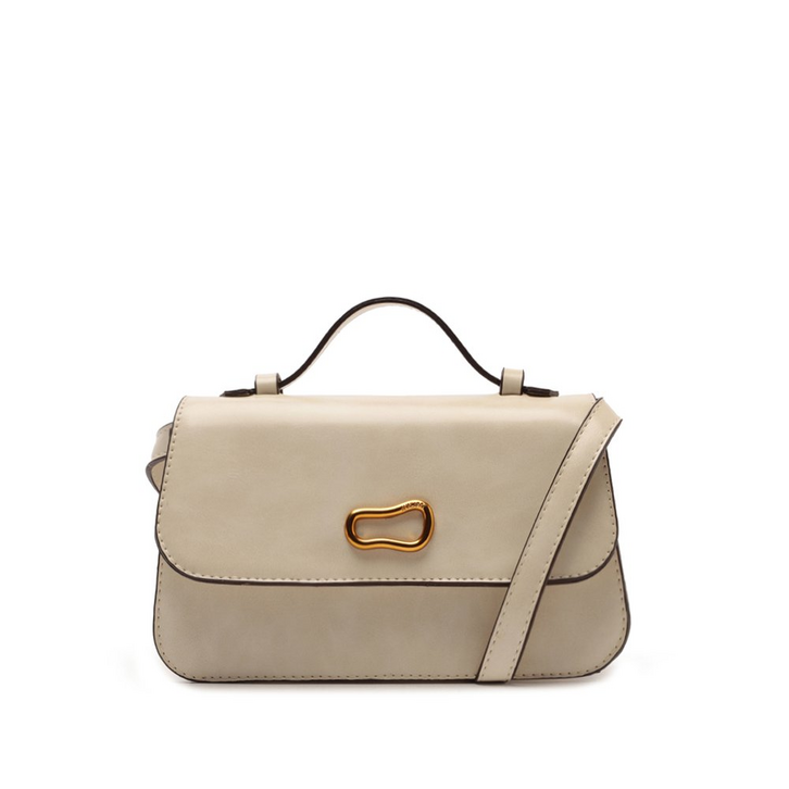 Bolsa tiracolo pequena, com adorno em metal, na cor branca. O modelo de material similar ao couro com acabamento envernizado, possui shape retangular e estruturado. No tamanho P, traz alça longa transversal regulável, com alça de ombro fixa, com forro em tom rosê e bolsinho na parte interna. Com detalhe de acabamentos a fio contrastantes por toda a peça, possui fecho no tampo, por botão de ímã.Traz aplicação de adorno metálico imponente - com shape orgânico - centralizado na parte superior do tampo, com detalhe para assinatura discreta e personalizada Anacapri.