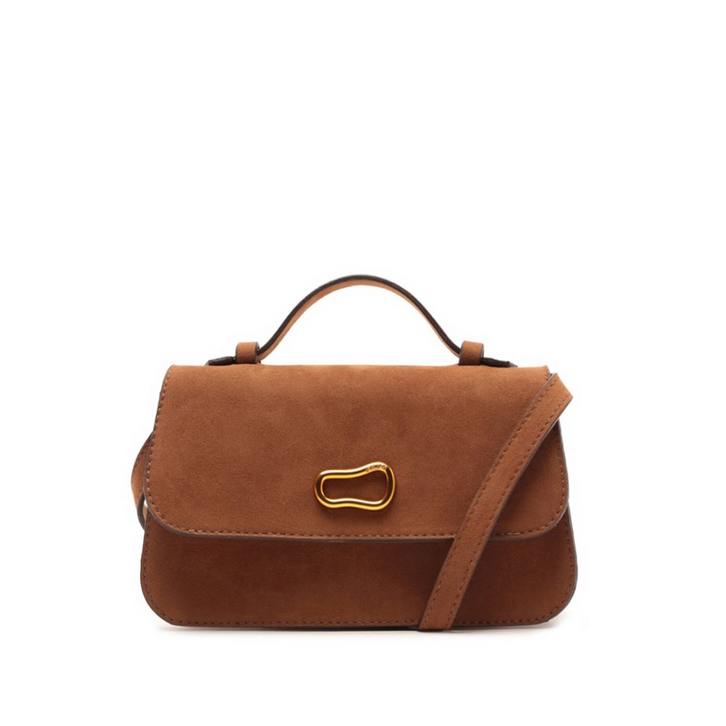 Bolsa tiracolo pequena, com adorno em metal, na cor marrom. O modelo em camurça, possui shape retangular e estruturado. No tamanho P, traz alça longa transversal regulável, com alça de ombro fixa, com forro em tom rosê e bolsinho na parte interna. Com detalhe de acabamentos a fio contrastantes por toda a peça, possui fecho no tampo, por botão de ímã.Traz aplicação de adorno metálico imponente - com shape orgânico - centralizado na parte superior do tampo, com detalhe para assinatura discreta e personalizada Anacapri.