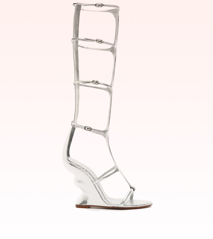 Bonnie apresenta salto cromado de curvas onduladas e cabedal em couro com formas triangulares interligadas, reinterpretando a salomé em uma proposta contemporânea. Disponível nas versões gladiadora e mule, possui salto de 100 mm e acabamento metalizado em duas cores. Um design marcante, com identidade e personalidade.