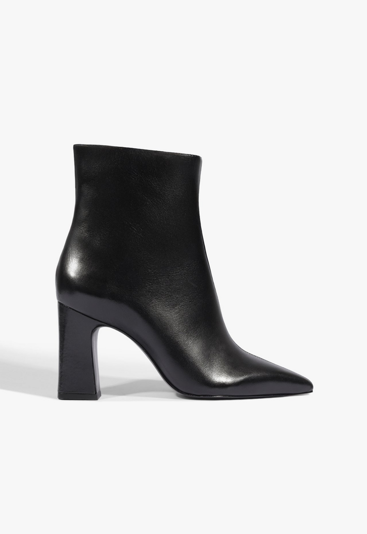 Bota de cano curto com salto alto e design elegante, ideal para produções modernas e sofisticadas. O modelo traz linhas clean e presença marcante, funcionando bem com vestidos, saias ou looks urbanos, garantindo versatilidade e um visual atual para diferentes ocasiões.