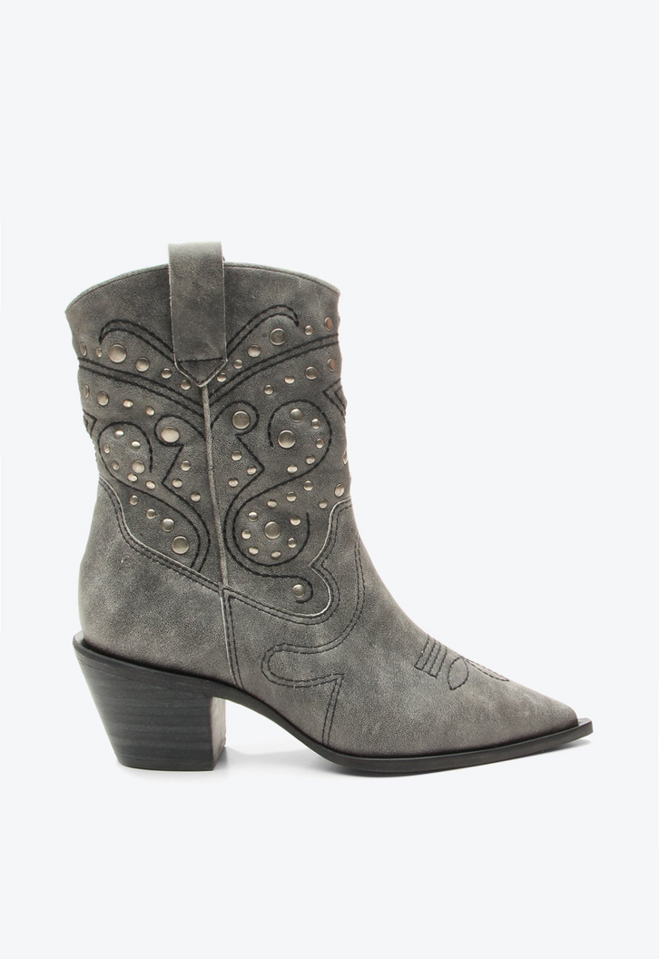 Bota Leslie Cinza é personalidade e atitude em um design expressivo. Com acabamento estonado em camurça, bico fino e cano médio de inspiração western, ganha destaque com aplicações de tachas metálicas que criam um relevo decorativo sofisticado. O salto bloco médio garante estabilidade e presença no caminhar. Um modelo urbano e cheio de identidade, ideal para quem busca impacto visual com elegância rústica.