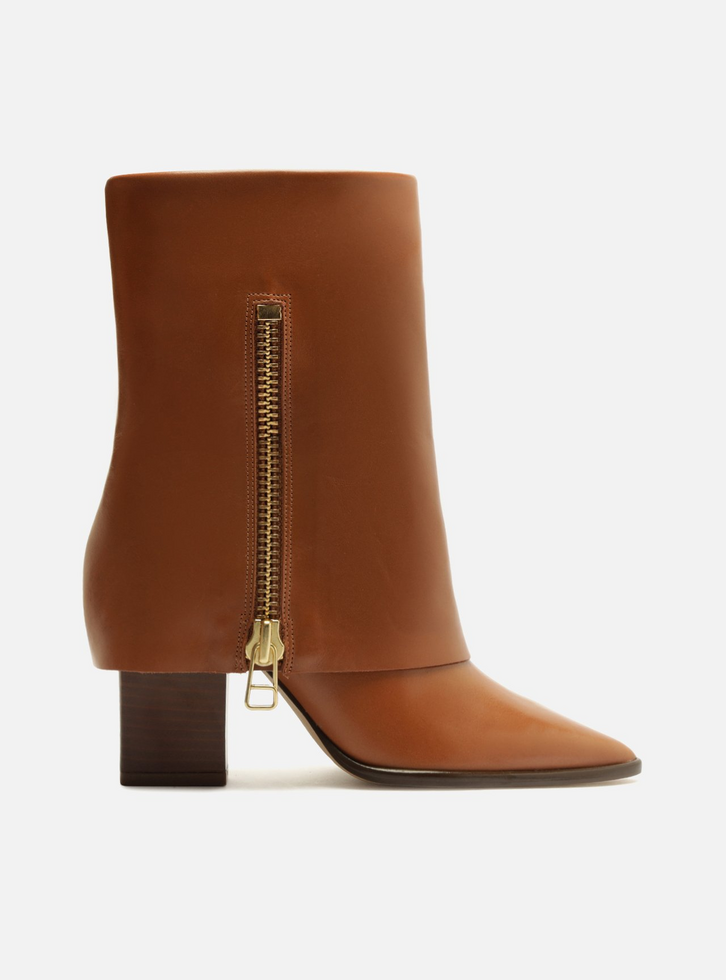 Bota marrom de couro. O sapato tem cano médio, salto alto bloco em fachete e formato fino na ponta. Possui capa sobreposta ao cano, em couro, com efeito de polaina. Conta com fecho em zíper destacado nas laterais interna e externa.