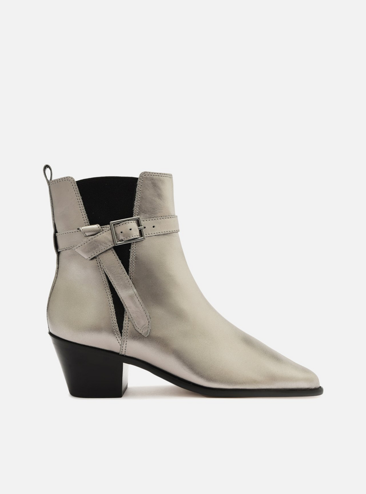 Bota prata em couro. O sapato tem cano curto, salto baixo bloco em fachete e ponta fina. Traz elástico preto nas laterais do cano e tira sobre o cano com fivela lateral. Com tira na parte traseira, que facilita o calce.