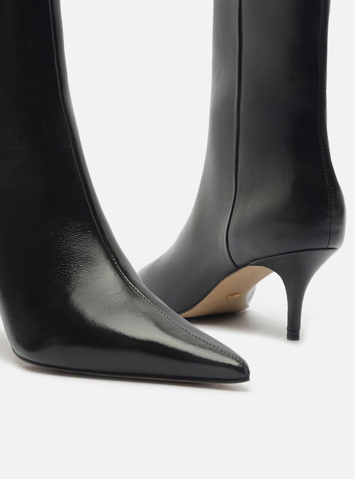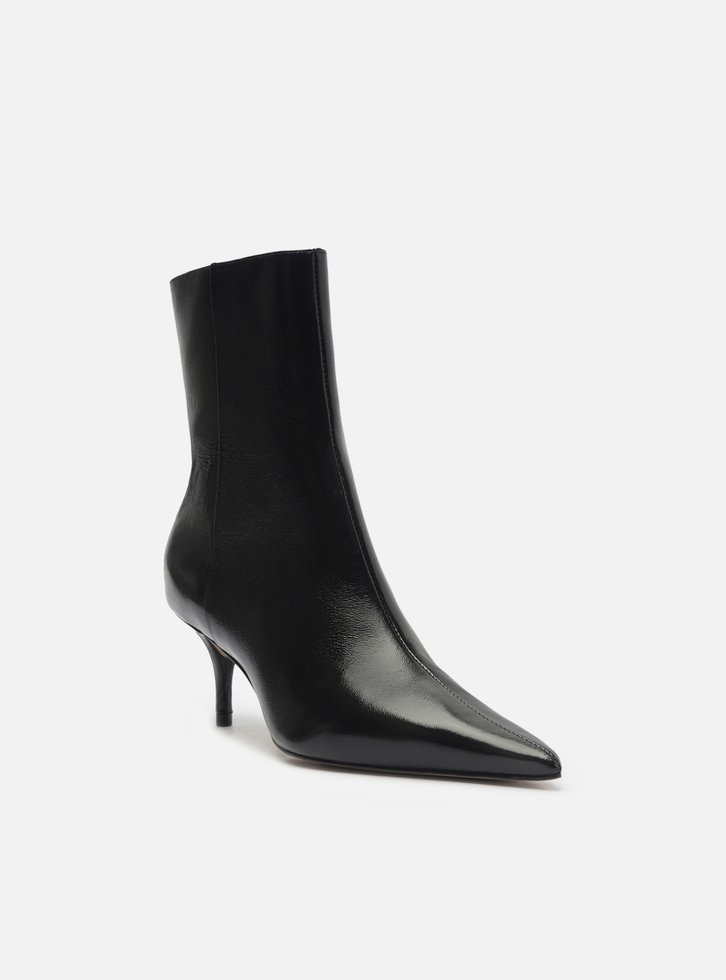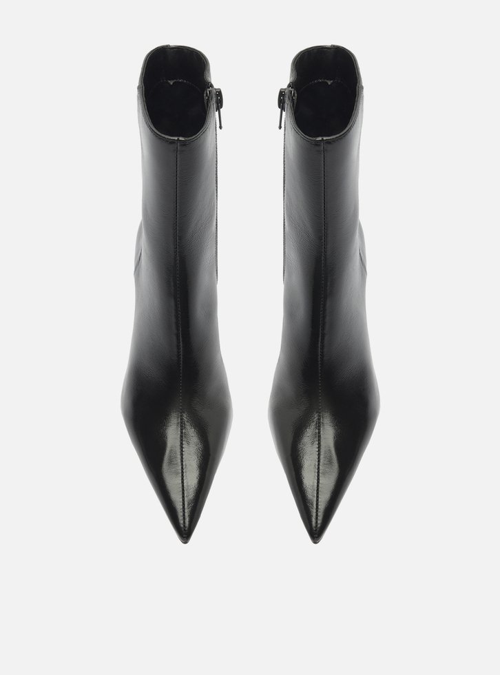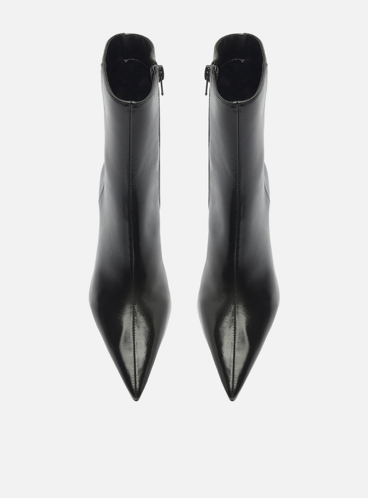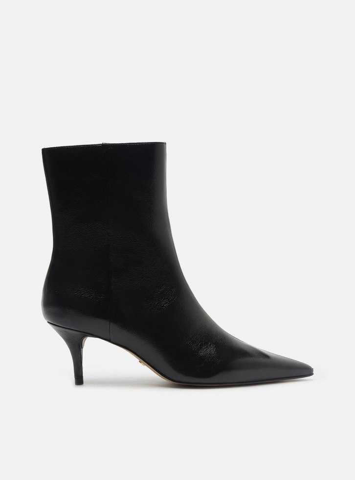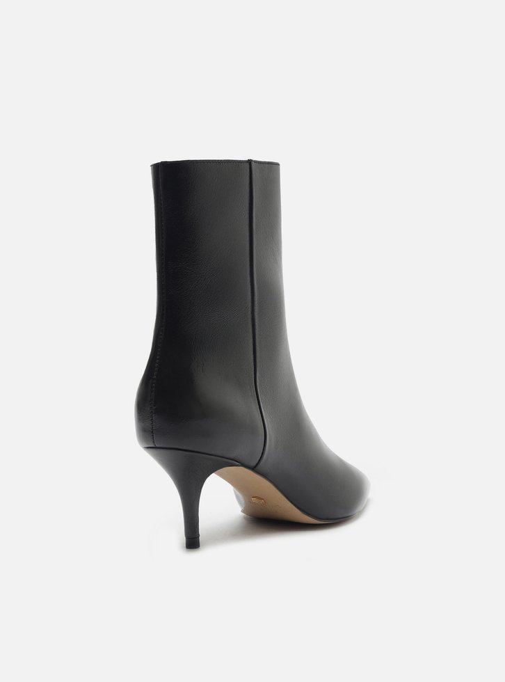 Bota feminina preta em couro. O sapato tem cano curto, salto baixo fino e ponta fina. Traz cabedal ajustado ao pé e fecho em zíper na lateral interna do cano.