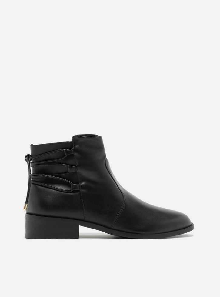 Bota preta de couro. O sapato tem cano curto, salto baixo bloco e formato arredondado na ponta. Traz cabedal ajustado ao pé e fecho em zíper na lateral interna do cano. Com detalhe recortado na lateral externa e tiras cruzadas na parte traseira do cano, com ponteiras e que fecham em nó.