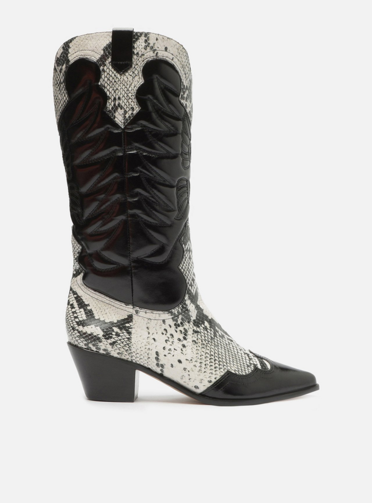 Bota preta e estampa snake em couro. O sapato tem cano médio, salto baixo bloco em fachete e ponta fina. Traz bordado western no cabedal e cano. Não possui fechamento. Com tiras como puxadores nas laterais do cano, facilitando o calce.