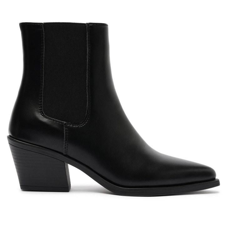 Bota Chelsea de salto bloco, na cor preta. O modelo tem cano curto, salto em bloco baixo e bico fino. Traz cabedal liso com efeito envernizado e elástico largo em uma das laterais do cano, com fechamento em zíper metálico na outra lateral do cano e detalhe discreto em costura pesponto nos contornos da bota.