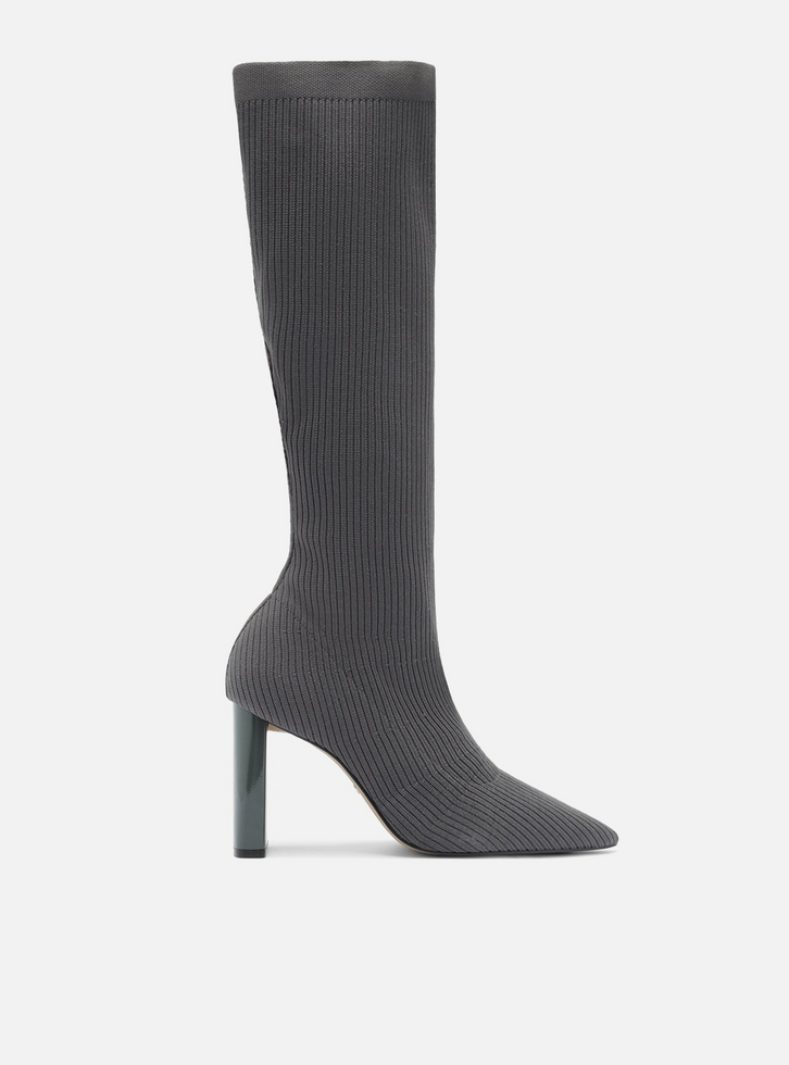 Bota cinza em tecido knit canelado. O sapato tem cano longo, salto alto barra envernizado e ponta fina. Traz cabedal ajustado ao pé e cano estilo meia.