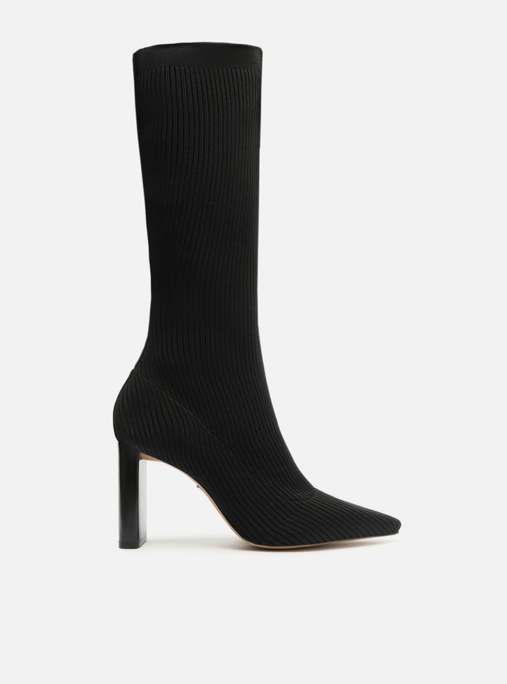 Bota preta em tecido knit canelado. O sapato tem cano longo, salto alto barra envernizado e ponta fina. Traz cabedal ajustado ao pé e cano estilo meia.