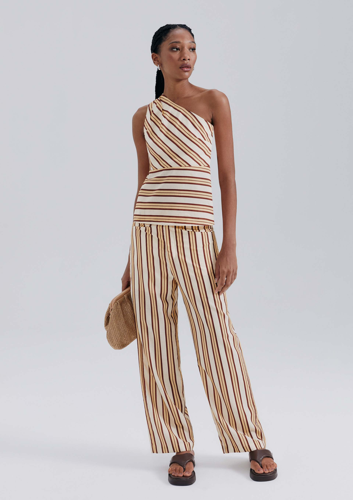 Conheça nossa calça feminina reta em tecido fio tinto listrado, que traz um toque moderno e sofisticado ao seu look. As listras conferem um efeito visual elegante, enquanto o corte reto garante conforto e versatilidade.