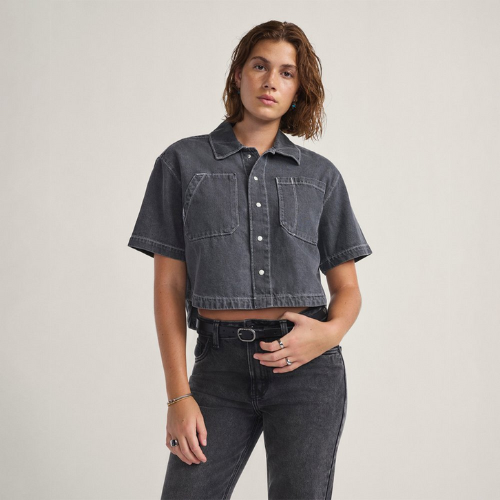 Mantenha o estilo “Off The Wall” do trabalho ao lazer. Inspirada em roupas de trabalho com um toque feminino, a Camisa Ss Natalie Denim Boxy Button Up Grey Wash combina um jeans robusto com efeito trançado com toques delicados, com botões de pressão perolados. O corte quadrado une tudo em uma silhueta: relaxada, oversized e casual.