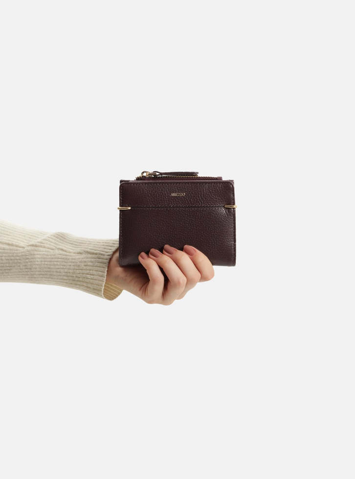 Carteira feminina pequena bordô de couro. O acessório tem formato quadrado e acabamento texturizado. Possui bolso superior com zíper e puxador. Parte interna na cor da carteira com divisórias e porta-cartões. Com detalhe em metais nas laterais da parte superior e inscrição do nome da marca.