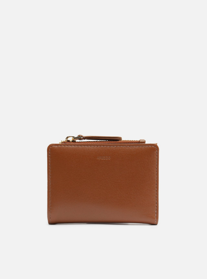 Carteira feminina pequena marrom de couro. O acessório tem formato quadrado, acabamento liso e fecho superior em zíper com puxador. Parte interna na cor da carteira com divisórias e porta-cartões. Com nome da marca na capa.