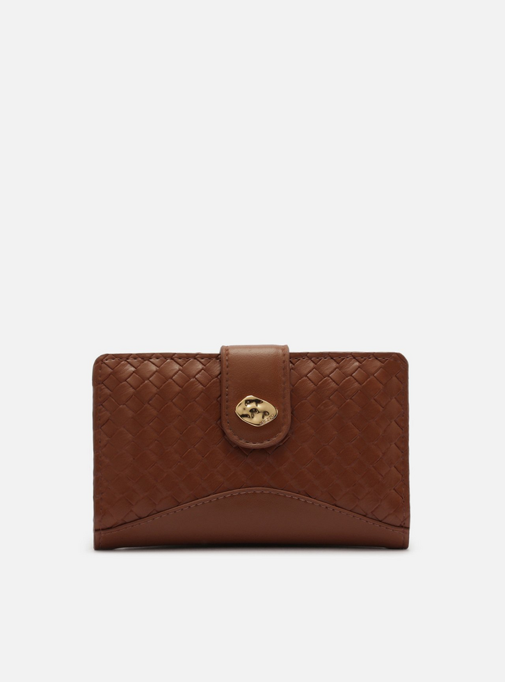 Carteira feminina média marrom. O acessório tem formato retangular e capas em tressê. Possui fecho em lapela com detalhe em metal dourado orgânico e botão. Parte interna na cor da carteira com divisórias e porta-cartões. Com inscrição do nome da marca na parte interna.