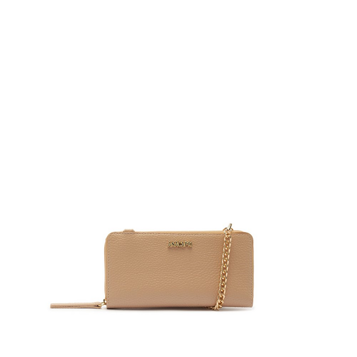 Carteira clutch, na cor bege. O acessório tem formato retangular em material similar ao couro, com acabamento a fio pintado. Traz alça transversal e removível em correntaria imponente e ombreira com regulagem. Forrada, acomoda celular com segurança e possui porta-cartão interno - com duas divisórias para acomodar cartões e documentos. Possui fechamento superior em zíper. Apresenta aplicaçãoo de pin metálico com assinatura Anacapri, centralizado na parte superior da capa frontal. 2 em 1, o modelo pode ser utilizado como bolsa ou carteira.