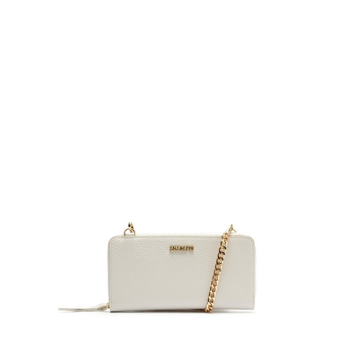 Carteira clutch, na cor branca. O acessório tem formato retangular em material similar ao couro, com acabamento a fio pintado. Traz alça transversal e removível em correntaria imponente e ombreira com regulagem. Forrada, acomoda celular com segurança e possui porta-cartão interno - com duas divisórias para acomodar cartões e documentos. Possui fechamento superior em zíper. Apresenta aplicaçãoo de pin metálico com assinatura Anacapri, centralizado na parte superior da capa frontal. 2 em 1, o modelo pode ser utilizado como bolsa ou carteira.