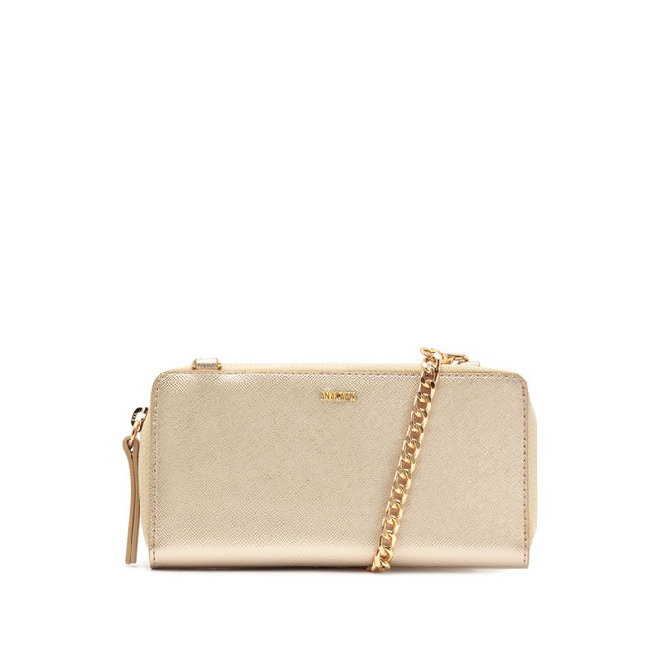 Carteira clutch, na cor dourada. O acessório tem formato retangular em material similar ao couro, com acabamento a fio pintado. Traz alça transversal e removível em correntaria imponente e ombreira com regulagem. Forrada, acomoda celular com segurança e possui porta-cartão interno - com duas divisórias para acomodar cartões e documentos. Possui fechamento superior em zíper. Apresenta aplicação de pin metálico com assinatura Anacapri, centralizado na parte superior da capa frontal. 2 em 1, o modelo pode ser utilizado como bolsa ou carteira.